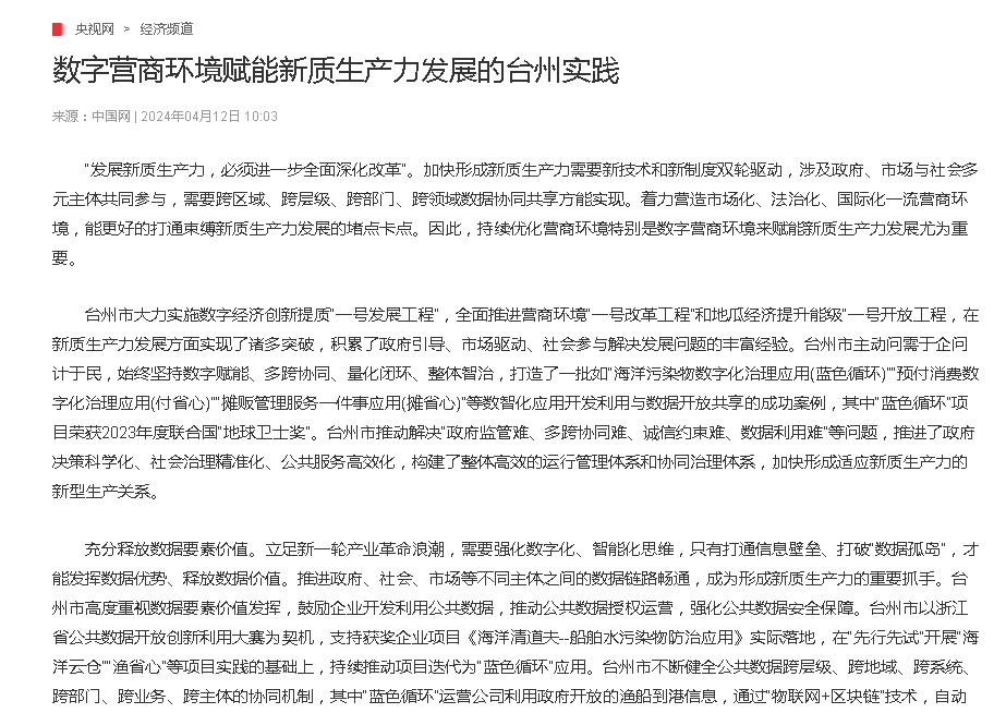 台州市大力实施数字经济创新提质“一号发展工程”,全面推进营商环境“一号改革工程”和地瓜经济提升能级“一号开放工程,在新质生产力发展方面实现了诸多突破,积累了政府引导、市场驱动、社会参与解决发展问题的丰富经验。台州市主动问需于企问计于民,始终坚持数字赋能、多跨协同、量化闭环、整体智治,打造了一批如“海洋污染物数字化治理应用(蓝色循环)”“预付消费数字化治理应用(付省心)”“摊贩管理服务一件事应用(摊省心)”等数智化应用开发利用与数据开放共享的成功案例,其中“蓝色循环”项目荣获2023年度联合国“地球卫士奖”。台州市推动解决“政府监管难、多跨协同难、诚信约束难、数据利用难”等问题,推进了政府决策科学化、社会治理精准化、公共服务高效化,构建了整体高效的运行管理体系和协同治理体系,加快形成适应新质生产力的新型生产关系。