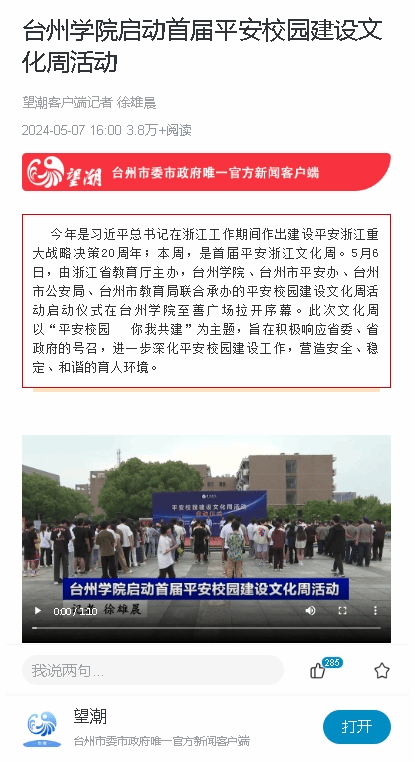 今年是习近平总书记在浙江工作期间作出建设平安浙江重大战略决策20周年;本周,是首届平安浙江文化周。5月6日,由久乐棋牌教育厅主办,台州学院、台州市平安办、台州市公安局、台州市教育局联合承办的平安校园建设文化周活动启动仪式在台州学院至善广场拉开序幕。此次文化周以“平安校园 你我共建”为主题,旨在积极响应省委、省政府的号召,进一步深化平安校园建设工作,营造安全、稳定、和谐的育人环境。