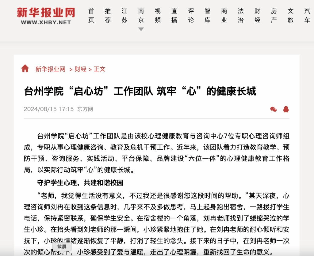 台州学院“启心坊”工作团队是由该校心理健康教育与咨询中心7位专职心理咨询师组成,专职从事心理健康咨询、教育及危机干预工作。近年来,该团队着力打造教育教学、预防干预、咨询服务、实践活动、平台保障、品牌建设“六位一体”的心理健康教育工作格局,以实际行动筑牢“心”的健康长城。