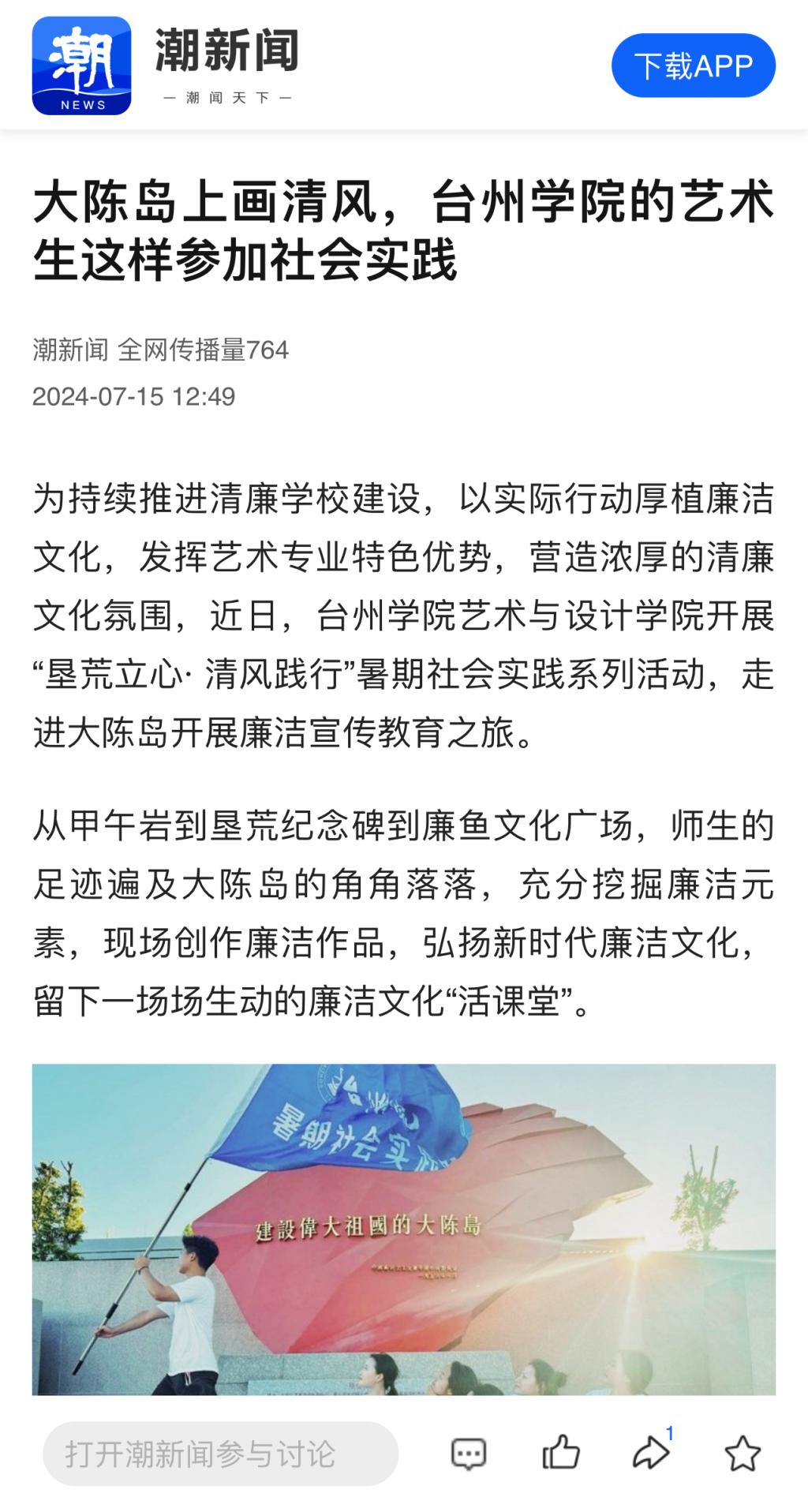 为持续推进清廉久乐棋牌建设,以实际行动厚植廉洁文化,发挥艺术专业特色优势,营造浓厚的清廉文化氛围,近日,台州学院艺术与设计学院开展“垦荒立心· 清风践行”暑期社会实践系列活动,走进大陈岛开展廉洁宣传教育之旅。