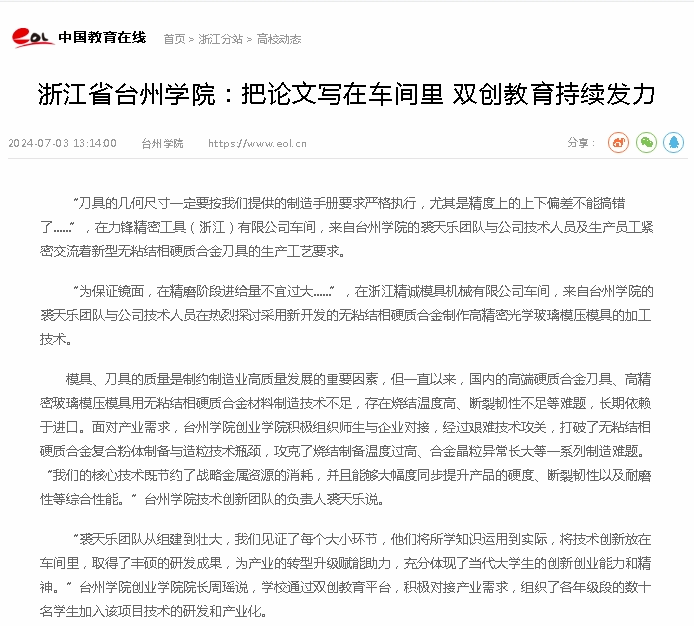 “刀具的几何尺寸一定要按我们提供的制造手册要求严格执行,尤其是精度上的上下偏差不能搞错了......”,在力锋精密工具(浙江)有限公司车间,来自台州学院的裘天乐团队与公司技术人员及生产员工紧密交流着新型无粘结相硬质合金刀具的生产工艺要求。
