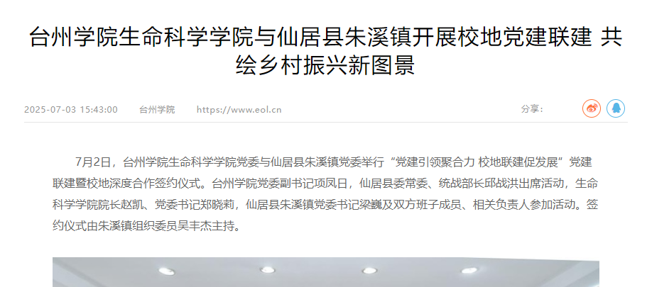 此次与仙居县朱溪镇的战略合作,标志着生命科学学院在深化校地合作、服务“三农”发展、推动共同富裕上迈出坚实一步。学院将以此次签约为契机,持续推动党建与业务深度融合,落实立德树人根本任务,服务乡村振兴国家战略。