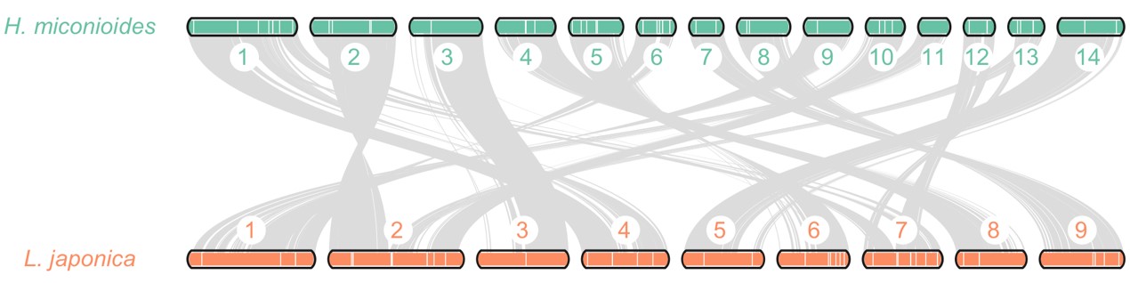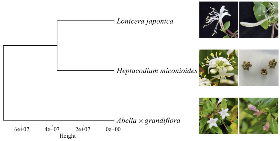 然而,自1916年Rehder报道七子花以来的一个多世纪,植物学家被其独特的形态学特征和分子生物学结果彼此不能印证的问题所困扰,难以确定其系统位置。该属的花序与忍冬属的盘叶组相似,而其子房和果实的构造则与六道木属接近,说明它是介于忍冬族(tribe Caprifolieae)和北极花族(tribe Linnaeeae)之间的一个类群。目前一部分学者重视经典的形态学特征,认为应将七子花属置于北极花族,而另一部分学者则强调现代分子生物学证据,多倾向于将其归入忍冬族内。准确划分物种的系统位置是对物种实施有效保护和科学利用的前提,上述七子花属的分类学争议严重阻碍了其保护与进一步合理开发利用。近日,胡金锋教授团队联合金则新教授团队在权威SCI期刊《Phytochemistry》上发表了题为“Major specialized natural products from the endangered plant Heptacodium miconioides, potential medicinal uses and insights into its longstanding unresolved systematic classification”的研究论文,从化学分类学角度为濒危植物七子花在忍冬科中的系统位置提出新证据。该论文对七子花的化学成分进行了较为系统研究,发现多个新化合物。进而开展了化学分类学分析:将花蕾化学成分HPLC指纹图谱与另外两种量丰的忍冬科植物忍冬(金银花)与大花六道木进行对比,并进行聚类分析(图3)。结果发现七子花与忍冬亲缘关系更为接近,应当同被归类于忍冬亚科之下。该结果亦进一步被忍冬与七子花植物次级代谢产物生物合成途径基因的共线性分析所证实(图4)。