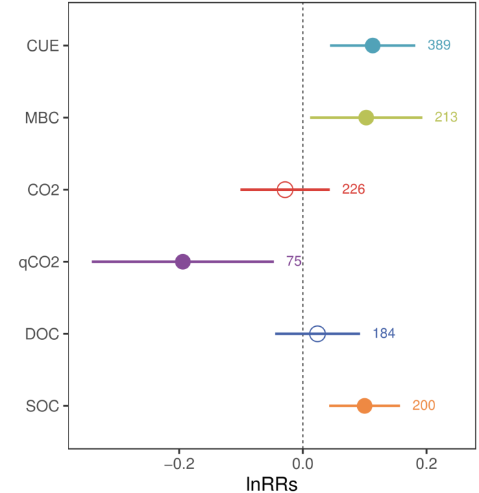 研究结果表明,养分添加使土壤微生物CUE增加了11.5%。添加养分的特征、生态系统及气候因子均能影响微生物CUE对养分添加的响应规律。养分输入后土壤氮素可用性和碳氮周转相关酶活性与微生物CUE分别呈显著正和负相关。值得注意的是,养分添加提高了微生物源碳的输入,促进了土壤碳积累,但微生物CUE与SOC呈现解耦关系,养分添加时微生物CUE对SOC的贡献并非人们认为的那样重要。该研究加深了全球范围内养分添加对微生物CUE的理解,并强调需要进行更多的研究关注微生物CUE在SOC固存中的作用。