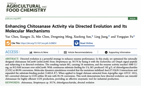 其中,题为“Enhancing Chitosanase Activity via Directed Evolution and Its Molecular Mechanisms”的论文由生命科学学院陈耀博士担任第一作者,台州学院付永前教授、孙小龙博士以及南京工业大学江凌教授为共同通讯作者。另一篇题为“Combining Signal Peptide Optimization with Directed Evolution to Enhance Chitosanase Activity”的论文同样以陈耀博士为第一作者,生物科学专业本科生陈敏和林新力为共同第一作者,台州学院付永前教授、尹丰伟博士以及南京工业大学江凌教授为共同通讯作者。