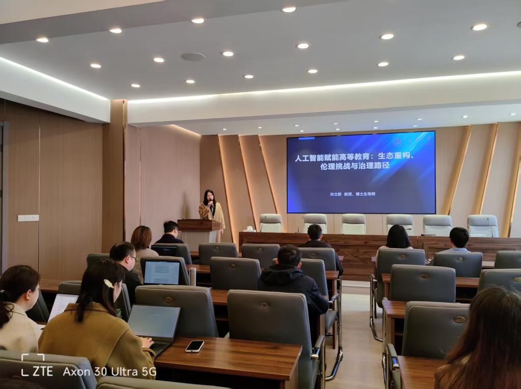 孙立新的讲座以人工智能重塑知识生产为背景,主要围绕高等教育的生态重构、技术应用的伦理困境、治理路径三个方面展开,揭示了人工智能重塑高等教育体系的样态,教学场景智能化跃迁、高等教育管理模式数字化转型以及科研范式智能化转型,同时也指出了运用人工智能面临的伦理困境,诸如教育公平的结构性失衡、学术生态的信任危机、主体价值的解构风险,提出了建立“动态评估-协同治理-文化重塑”三位一体的治理体系,为高等教育智能化转型提供理论支撑与实践指南。