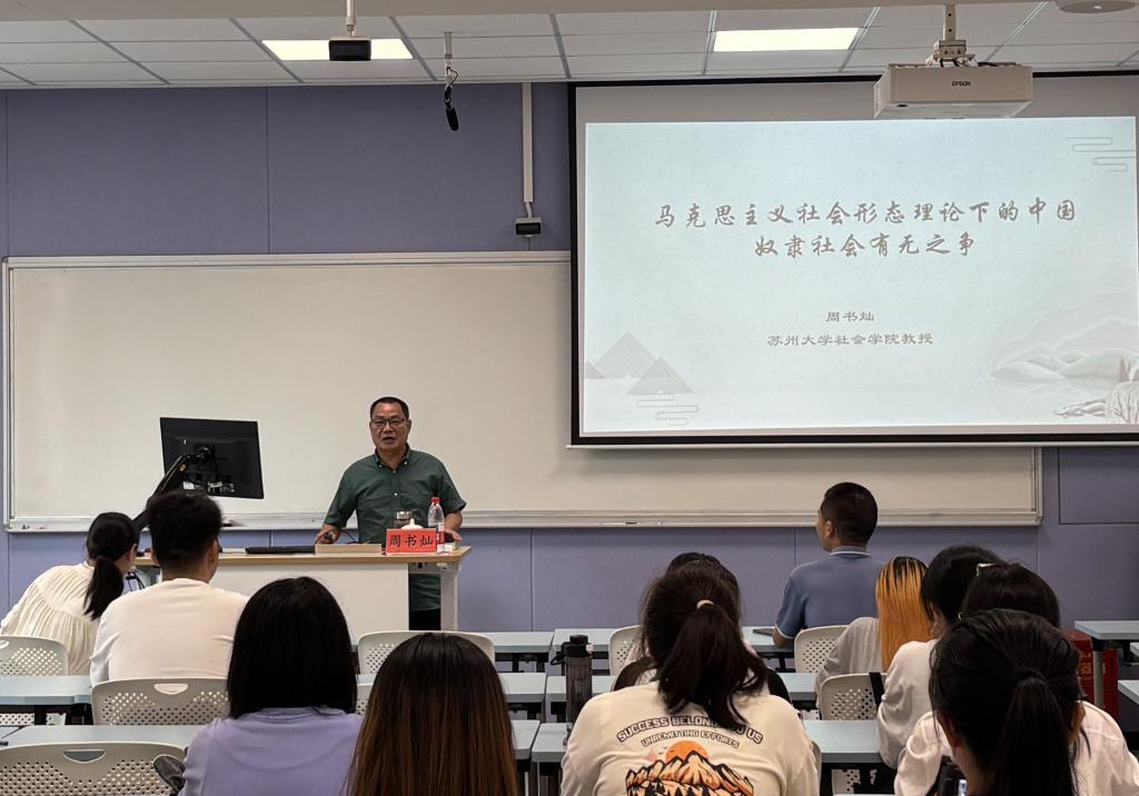 讲座伊始,周书灿教授回顾了20世纪30年代郭沫若运用马克思主义经典理论研究中国古代社会的开创性工作,指出这标志着中国马克思主义史学范式的确立。他提到,经过数代学者的持续探索,“中国存在奴隶社会”逐渐成为学界主流观点。接着,周教授表示,马克思与恩格斯认为奴隶制在古代社会具有普遍性,并明确区分了古希腊、古罗马的“劳动奴隶制”与东方的“家庭奴隶制”,为后续研究提供了重要的理论参照。