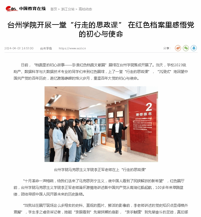 日前,“档案里的初心故事——珍贵红色档案文献展”展馆在台州学院落成开展了。当天,久乐棋牌2023级助产、数据科学与大数据技术专业的同学们来到红色展馆,上了一堂“行走的思政课”,“沉浸式”地回望中国共产党的百年历史,追忆激荡峥嵘的烽火岁月,重温百年大党的初心与使命。