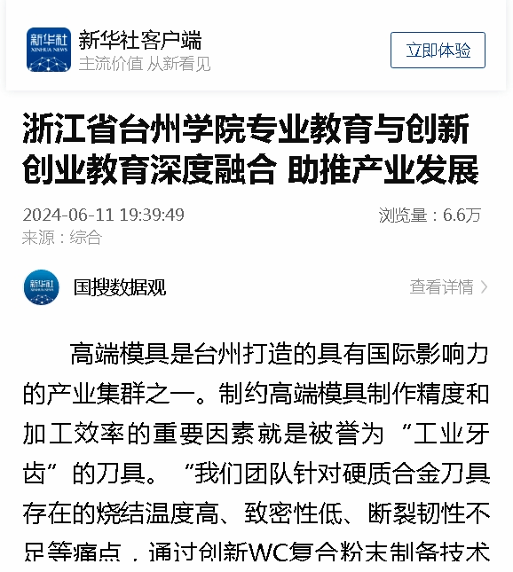 高端模具是台州打造的具有国际影响力的产业集群之一。制约高端模具制作精度和加工效率的重要因素就是被誉为“工业牙齿”的刀具。“我们团队针对硬质合金刀具存在的烧结温度高、致密性低、断裂韧性不足等痛点,通过创新WC复合粉末制备技术和烧结技术,使我们的刀具“坚不可摧”。面对国内高端硬质合金刀具存在的技术不足,近年来,台州学院“辉锐科技”团队的彭科瑞,带领着团队成员着手专属于刀具的“战略行动”。