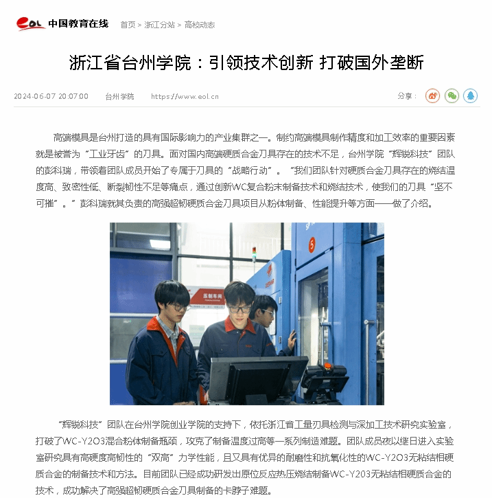高端模具是台州打造的具有国际影响力的产业集群之一。制约高端模具制作精度和加工效率的重要因素就是被誉为“工业牙齿”的刀具。面对国内高端硬质合金刀具存在的技术不足,台州学院“辉锐科技”团队的彭科瑞,带领着团队成员开始了专属于刀具的“战略行动”。“我们团队针对硬质合金刀具存在的烧结温度高、致密性低、断裂韧性不足等痛点,通过创新WC复合粉末制备技术和烧结技术,使我们的刀具“坚不可摧”。”彭科瑞就其负责的高强超韧硬质合金刀具项目从粉体制备、性能提升等方面一一做了介绍。