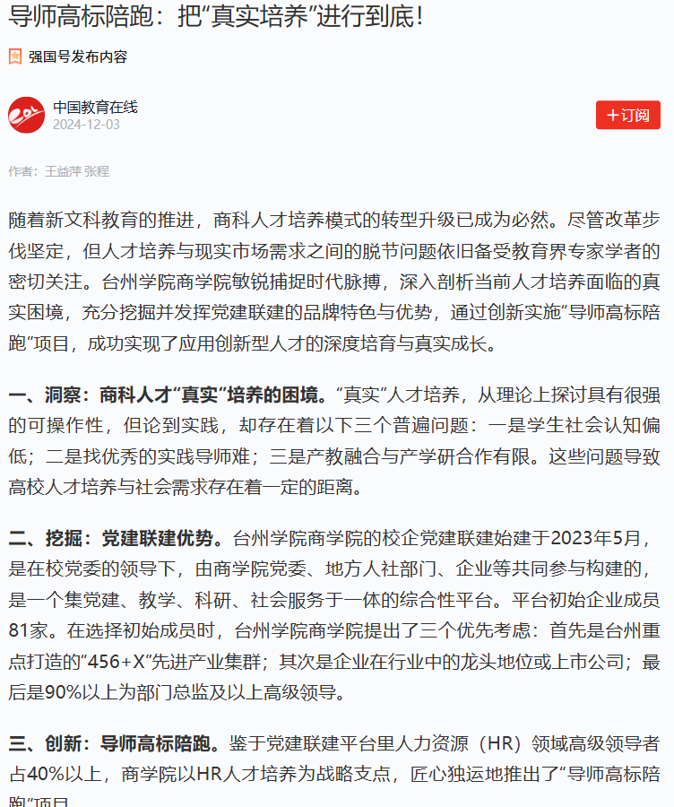 随着新文科教育的推进,商科人才培养模式的转型升级已成为必然。尽管改革步伐坚定,但人才培养与现实市场需求之间的脱节问题依旧备受教育界专家学者的密切关注。台州学院商学院敏锐捕捉时代脉搏,深入剖析当前人才培养面临的真实困境,充分挖掘并发挥党建联建的品牌特色与优势,通过创新实施“导师高标陪跑”项目,成功实现了应用创新型人才的深度培育与真实成长。