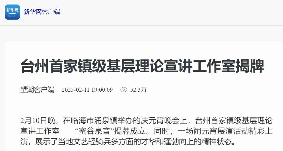2月10日晚,在临海市涌泉镇举办的庆元宵晚会上,台州首家镇级基层理论宣讲工作室——“蜜谷泉音”揭牌成立。同时,一场闹元宵展演活动精彩上演,展示了当地文艺轻骑兵多方面的才华和蓬勃向上的精神状态。