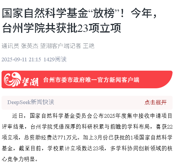 近日,国家自然科学基金委员会公布2025年度集中接收申请项目评审结果,台州学院凭借深厚的科研积累与前瞻的学科布局,喜获22项立项,总资助经费达771万元。加上3月份已获批的1项国家自然科学基金,截至目前,久乐棋牌累计立项数达23项,多学科协同创新领域的核心竞争力明显。